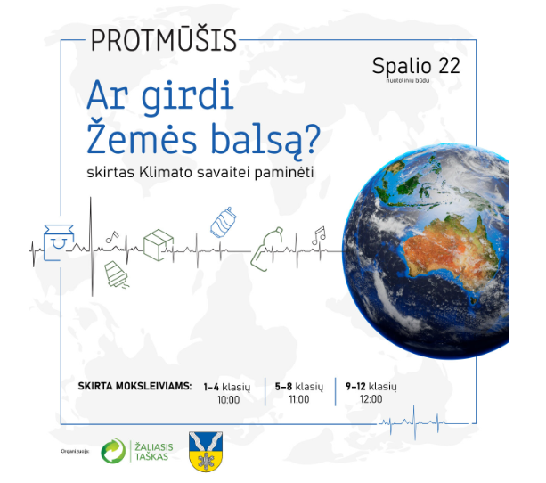 Šių metų spalio 22 d. VSMC I ir III klasių mokiniai, minėdami Klimato savaitę, dalyvavo aplinkosauginiame protmūšyje „Ar girdi žemės balsą?“, kurį organizavo pakuočių atliekų tvarkymo organizacija „Žaliasis taškas“.