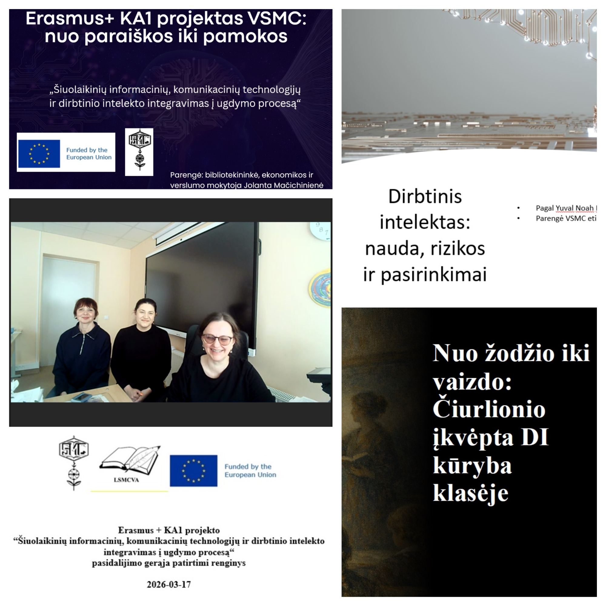 Renginio pradžioje sveikinimo žodį tarė VSMC direktorė Natalja Kimso, vėliau pristatyti trys pranešimai. Jolanta Mačichinienė, bibliotekininkė ir ekonomikos ir verslumo mokytoja, kalbėjo apie projekto idėją ir tikslus, mokytojų dalyvavimą tarptautiniuose mokymuose Vienoje (Austrija), praktinę šios patirties naudą gimnazijai, mokytojams ir mokiniams. Pabrėžta, kad projektas padeda stiprinti skaitmenines kompetencijas, drąsiau taikyti dirbtinio intelekto įrankius ugdyme ir kurti įtraukesnę mokymosi aplinką. Antrajame, lietuvių kalbos ir literatūros mokytojos Oksanos Aleknavičius, pranešime pasidalyta patirtimi organizuojant integruotų lietuvių kalbos ir literatūros bei informatikos pamokų ciklą. Mokiniai, interpretuodami M. K. Čiurlionio kūrybą, mokėsi analizuoti tekstus, ieškoti raktinių žodžių ir kurti vaizdų generavimo užklausas. Tai parodė, kaip dirbtinis intelektas gali būti kūrybiškai ir prasmingai taikomas pamokose. Trečią pranešimą pristatė etikos ir geografijos mokytoja Ilona Mikulėnienė remiantis Yuval Noah Harari knyga „Nexus“. Buvo aptarta dirbtinio intelekto nauda, rizikos ir atsakingo pasirinkimo svarba. Dalyviai buvo pakviesti pažvelgti į DI ne tik kaip į galimybę, bet ir kaip į reiškinį, keliantį etinių, socialinių bei informacinio saugumo klausimų.
