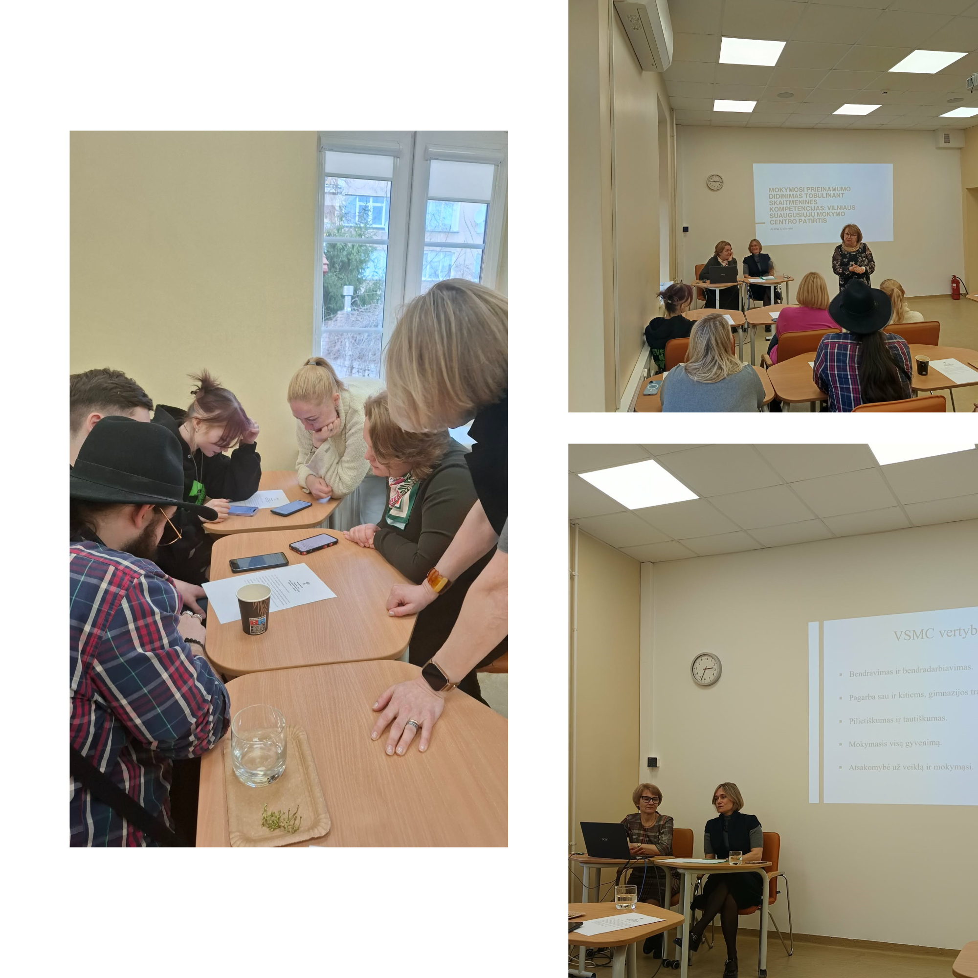 VSMC mokytojai pristatė parengtus pranešimus: ekonomikos vyresn. mokytoja Danutė Pirtinienė – „Vilniaus suaugusiųjų mokymo centro istorija ir veikla“, matematikos ir informatikos mokytoja metodininkė Jelena Aleknienė – „Mokinių mokymosi prieinamumo gerinimas, mokytojų skaitmeninių kompetencijų, tame tarpe dirbtinio intelekto, tobulinimas“, anglų kalbos mokytoja metodininkė Ana Tymčiuk – „VSMC Erasmus+KA2 ir NordPlus Adult projektų vykdymas“, ekonomikos ir verslumo mokytoja, bibliotekininkė Jolanta Mačichinienė – „Praktinis įgytos dirbtinio intelekto naudojimo kompetencijos taikymas pamokoje“.